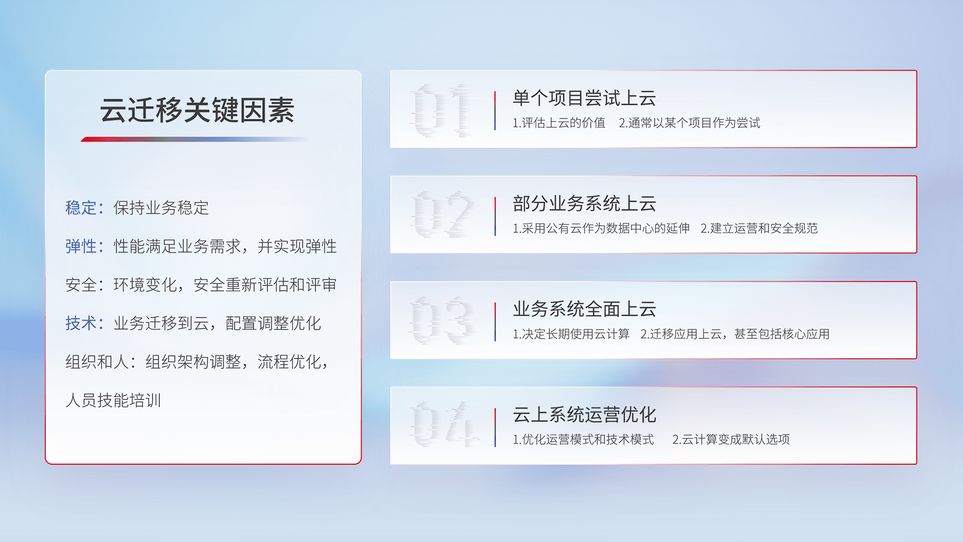 结合实际业务,,,从规划设计、、云平台选型、、、云原生改造、、数据迁移、、、、集成交付,,迁移全过程为客户识别最佳上云路径,,,,做好风险识别管理,,,,设计网络架构、、身份权限、、、、安全审计合规、、、操作审计、、、、日志审计、、、监控告警策略、、多站点容灾设计等,,,,对云上基础设施进行整体规划,,提升IT治理水平,,以满足弹性、、、高可用、、高性能的需求。。。。